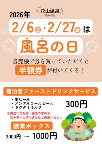 今月は2月27日に加えて2月6日もお得な風呂の日! 券売機で券を買っていただくと 半額券が付いてくる! 酸素ボ…